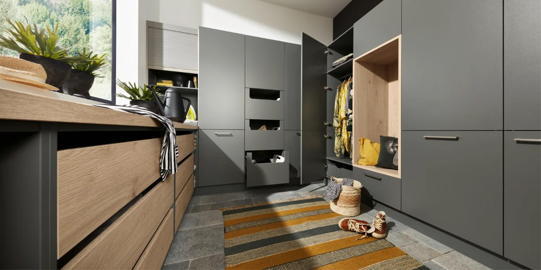 Cette buanderie se distingue par de généreux espaces de rangement, de larges tiroirs et une multitude d’aides discrètes. Le linge sale et frais est parfaitement organisé. Ainsi, tout reste à sa place et ne se disperse pas dans toute la maison.