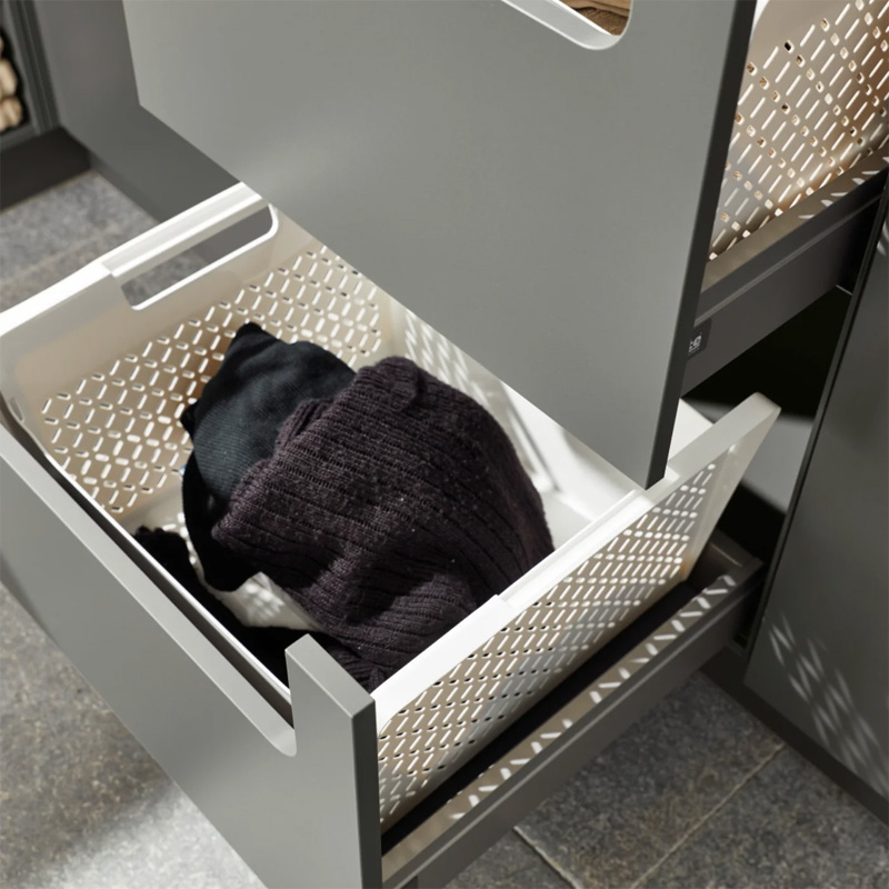 Les différents paniers à linge disparaissent tout simplement dans les armoires. Ainsi, tout est déjà trié ; plus rien ne tombe ou ne vole à travers la pièce.
