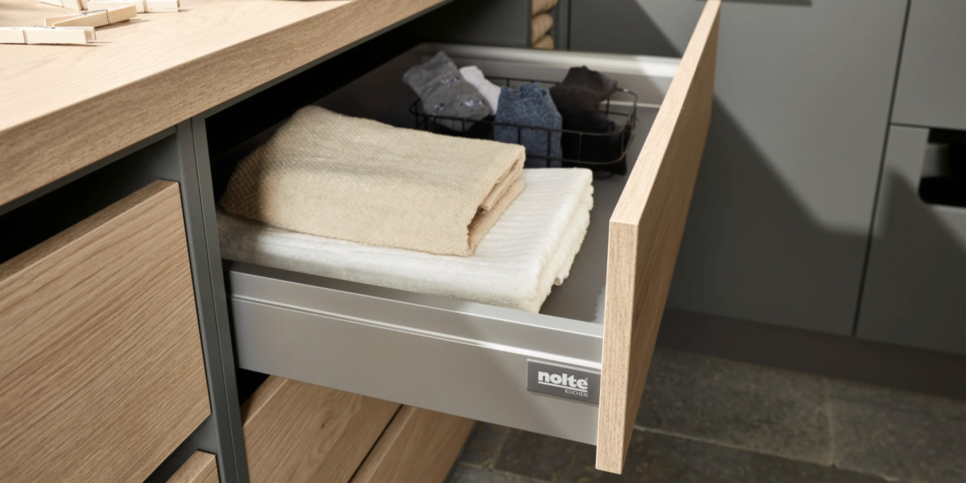 Dans les tiroirs spacieux, vous pouvez accéder rapidement à de nombreux petits objets, comme par exemple des serviettes, des ustensiles de lavage ou des sacs poubelle.