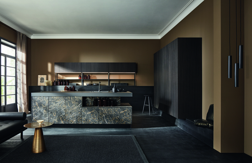 cuisine néo moderne mélaminé aspect marbre sans poignée